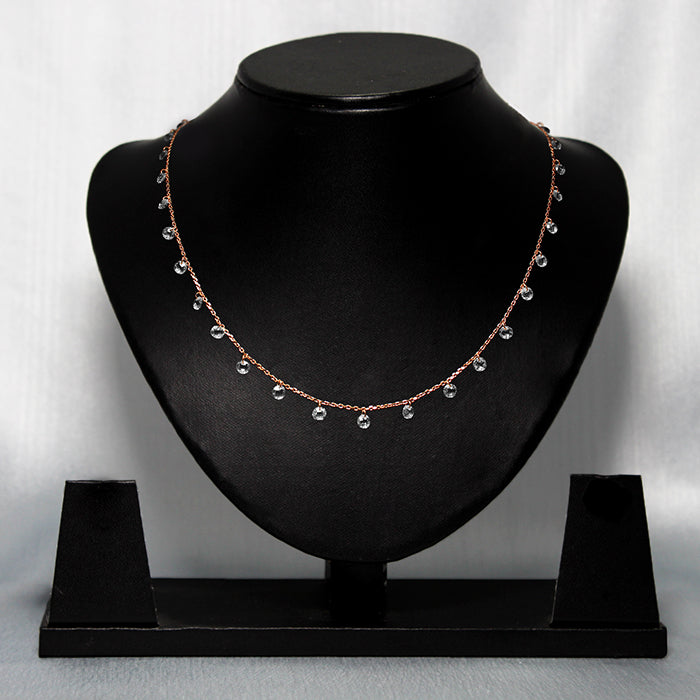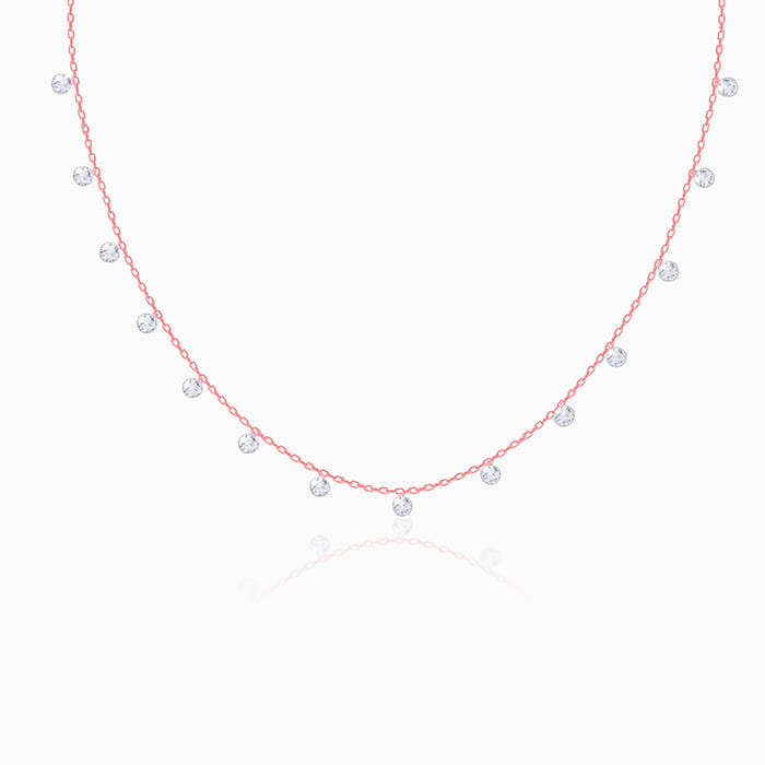 This rose gold necklace has zircon charms spaced throughout the chain length.